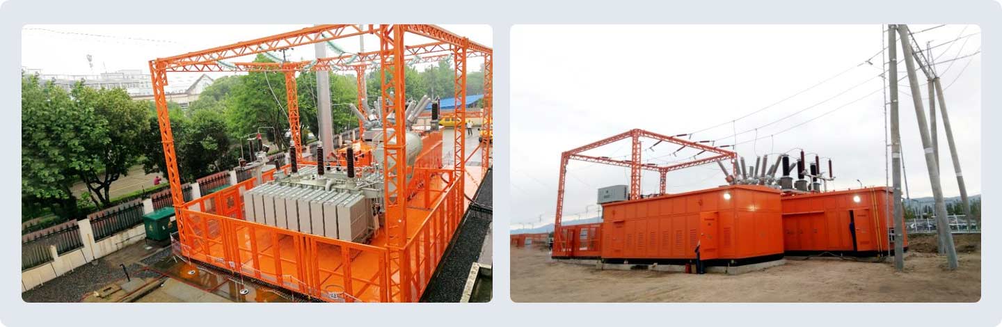 負(fù)荷轉(zhuǎn)移方案是基于現(xiàn)有戶外箱式變電站產(chǎn)品的成熟制造技術(shù),結(jié)合“標(biāo)準(zhǔn)化設(shè)計(jì)、工廠化加工、裝配式建設(shè)”的特點(diǎn),將變電站中110kV系統(tǒng)、主變部分、35kV系統(tǒng)、10kV系統(tǒng)、無功補(bǔ)償系統(tǒng)、接地變消弧線圈系統(tǒng)、二次綜自保護(hù)系統(tǒng)等在工廠內(nèi)安裝調(diào)試好分別裝入一個(gè)可移動、密封、防潮、防銹的預(yù)制艙體內(nèi),從而實(shí)現(xiàn)了電網(wǎng)建設(shè)改造中一、二次系統(tǒng)的集成化、裝配模塊化、建設(shè)過程工廠化、施工簡單化的“四化”戶外裝置,縮短了生產(chǎn)周期,降低了工程造價(jià),無需做土建基礎(chǔ),電纜側(cè)進(jìn)側(cè)出,提高了電網(wǎng)改造過程中的可靠性,滿足了安全過渡、快速投運(yùn)的使用要求。